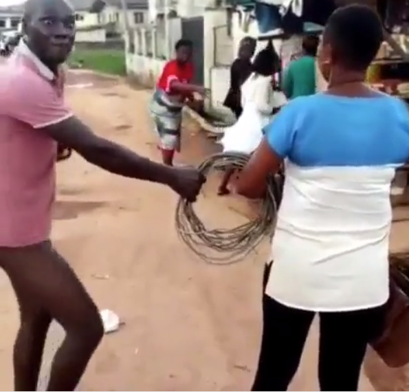 A PHCN staff is seen holding his disconnected cable in her arm while the man struggles to get it back. He asks her a few times to release the power cables but she remains adamant.