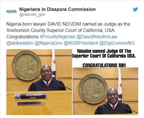 According to Nigerians in Diaspora Commission (NIDCOM), he was appointed as the judge of the Snohomish County Superior Court of California in the US.