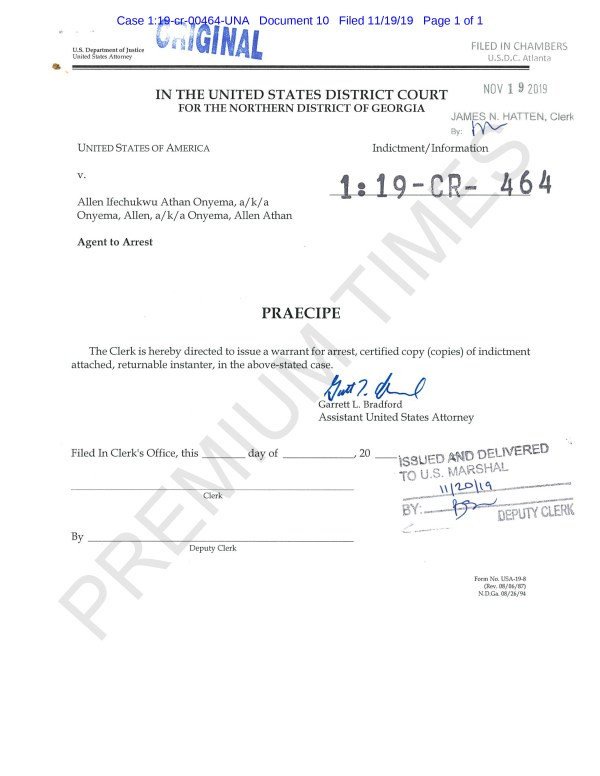 The U.S. Marshals Service were authorized by the warrant signed by Magistrate of the court Justin Anand, to take Mr Onyema into custody.
