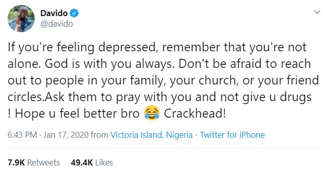 An angry Davido took to his Twitter page to accuse King Patrick of being a crackhead who is depressed and urged him to get help even though he never specifically mentioned his name.