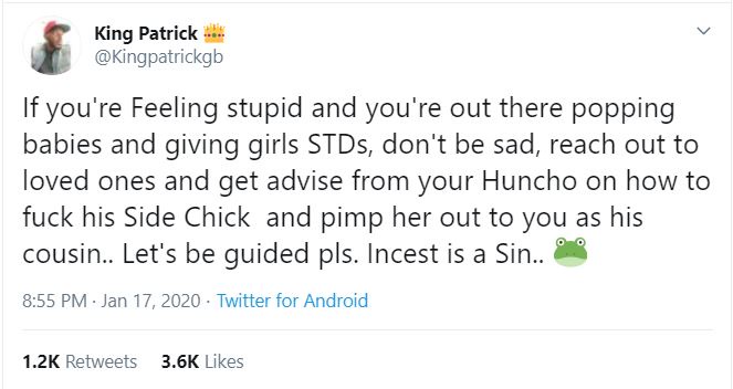 "If you're Feeling stupid and you're out there popping babies and giving girls STDs, don't be sad, reach out to loved ones and get advise from your Huncho on how to fuck his Side Chick and pimp her out to you as his cousin.. Let's be guided pls. Incest is a Sin.. 🐸"