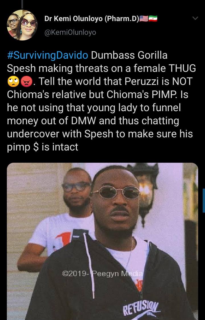 King Patrick's latest revelation points to a report by Kemi Olunloyo who had in the past alleged that Chioma had been sleeping around with some industry personalities. In fact, Kemi Olunloyo even released evidence showing a tweet in which Davido's Director of Corporate Sponsorship King Spesh of DMW revealed that Chioma had been sleeping aroundwith different men and that Peruzzi knew about it.