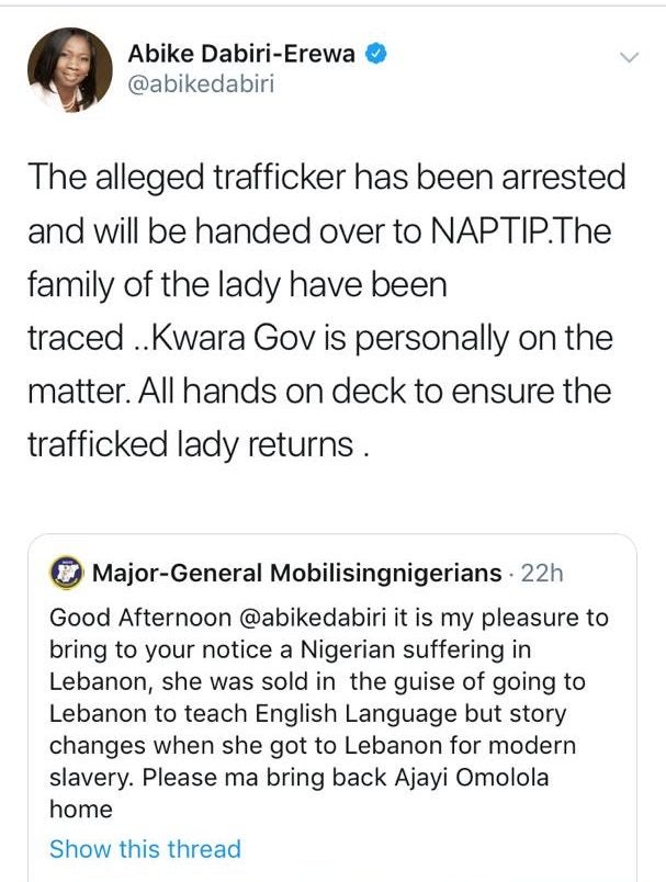 Chairman, Nigerians in Diaspora Commission, Abike Dabiri-Erewa has revealed that the trafficker who sold a Nigerian girl into slavery in Lebanon has been arrested.