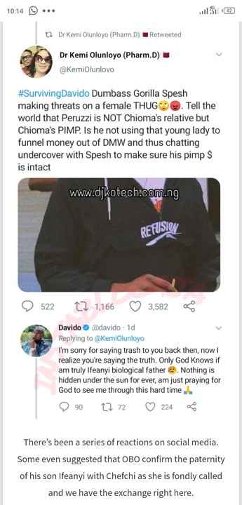 Davido replied Dr Kemi Olunloyo saying his sorry for talking trash to her back then about Peruzzi and Chioma relationship.