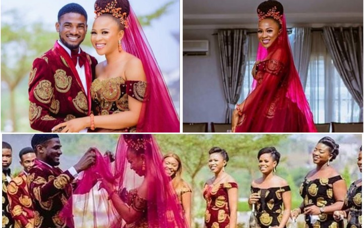 A newly wedded Igbo couple decided to take creativity to the next level after they ditched the usual Black Suit and White Wedding gown dress for the popular Igbo Isi-agu attire and people are wowed by it.