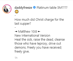 Sharing a photo of the show's ticket, Freeze asked how much Christ charged for the last supper. He added a part in the bible that says gifts received freely should be given out freely.